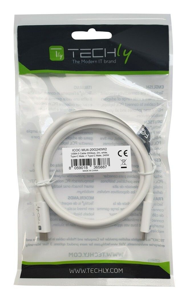 Techly ICOC-MU4-20G240W2. Kabellänge: 2 m. Anschluss 1: USB C, Anschluss 2: USB C, USB-Version: USB4 Gen 2x2, Max. Datenübertragungsrate: 20 Gbit/s, Produktfarbe: Weiß