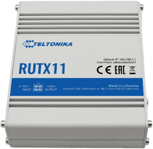 Teltonika RUTX11. WAN-Verbindungstyp: RJ-45. WLAN-Band: Dual-Band (2,4 GHz/5 GHz), Top WLAN-Standard: Wi-Fi 5 (802.11ac), WLAN Datentransferrate (max.): 867 Mbit/s. Schnittstellentyp Ethernet-LAN: Gigabit Ethernet, Ethernet LAN Datentransferraten: 10,100,1000 Mbit/s. Mobilfunknetzgenerierung: 4G, 3G-Standards: DC-HSDPA, WCDMA, 4G-Standard: LTE. Unterstützte Sicherheitsalgorithmen: SSH, SSL/TLS