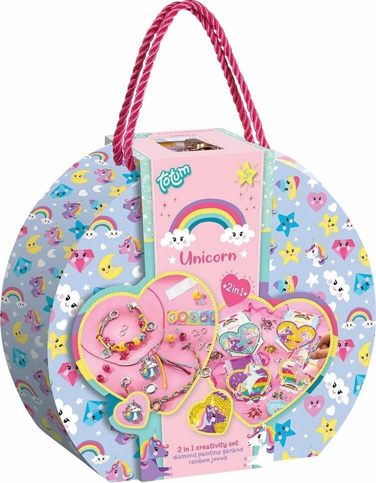 Mit diesem wundervollen Set haben Einhorn-Fans gleich doppelten Bastelspaß! Bastle dir einen bunten zauberhaften Regenbogenschmuck. Mit dem vielen Zubehör, den schicken Perlen und unterschiedlichen Bändern kannst du ganz individuelle und immer wieder neue Armbänder basteln. Mache dir und deinen Freundinnen eine Freude und mache jedem ein eigenes Freundschaftsband mit tollen Anhängern. Mach deine Welt ein kleines bisschen glitzernder. Gestalte die vier verschiedenen Schablonen mit wunderschönen Einhornmotiven im Glitzerlook. Dafür klebst du einfach die vielen Strasssteine auf die Motive - ganz wie es dir gefällt. Perfekt für ein glitzerndes Kinderzimmer oder zum Verschenken an Freunde und deine Familie. Nicht für Kinder unter 5 Jahren geeignet.