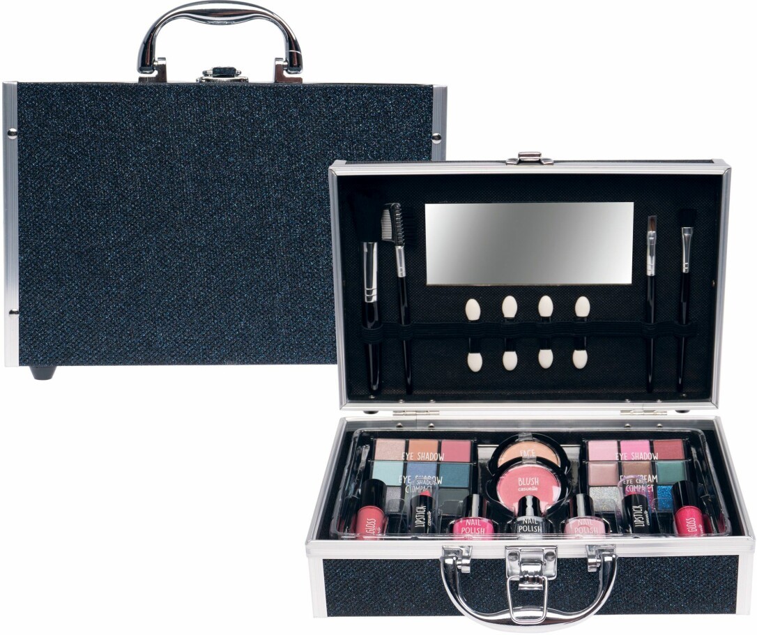 Casuelle Kosmetikkoffer mit blau schwarz glitzernen Oberfläche, 25 x 19 x 7,5 cm, Inhalt: 1 x Spiegel, 2 x Lippenstifte, 2 x Lipgloss, 3 x Nagellacke, 2 x Blusher, 24 x Lidschatten, 4 x Applikatoren und 4 x Kosmetik Bürsten, 8 Stück im Exportkarton.