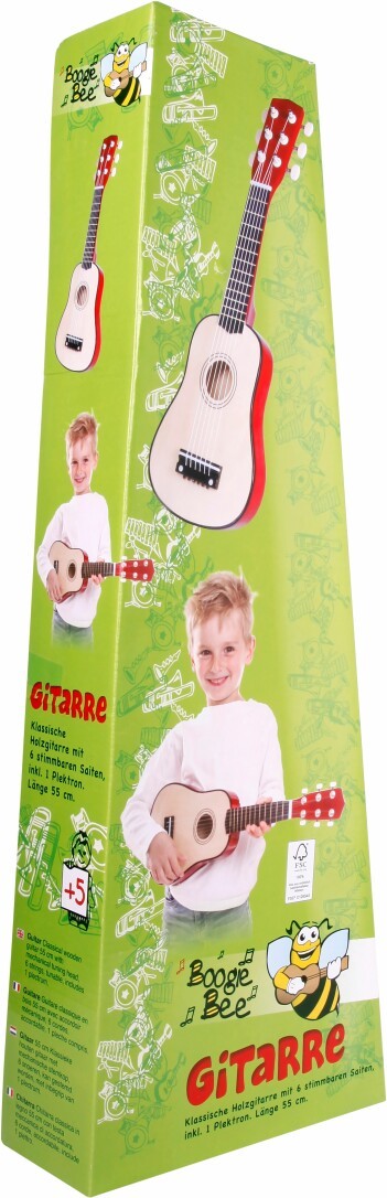 Boogie Bee Holzgitarre mit 6 Saiten und Tasten hinter dem Griff. Höhe 55cm. Notentext: Oh Susanna und Happy Birthday. Für Kinder ab 5 Jahren.