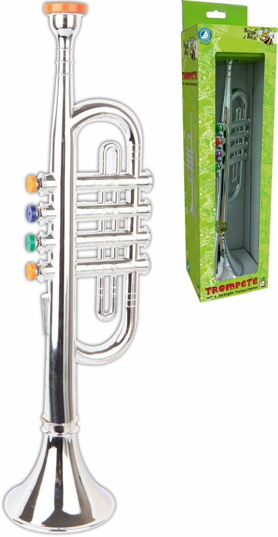 Boogie Bee Trompete silber, mit 4 Tasten. Länge ca. 38 cm. Auf Blisterkarte. Kartengröße: W190 x H480mm. Für Kinder ab 3 Jahren.