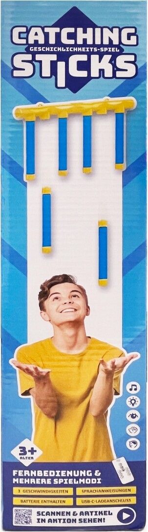 Geschicklichkeitsspiel - behalte alle Stäbe im Blick und fange sie, ohne einen zu übersehen. Mit Licht und Sound, Infrarot-Fernbedienung, mit USB Anschluss. Inklusive Batterie. Maße ca. 39x5x19 cm. Für Kinder ab 3 Jahren.