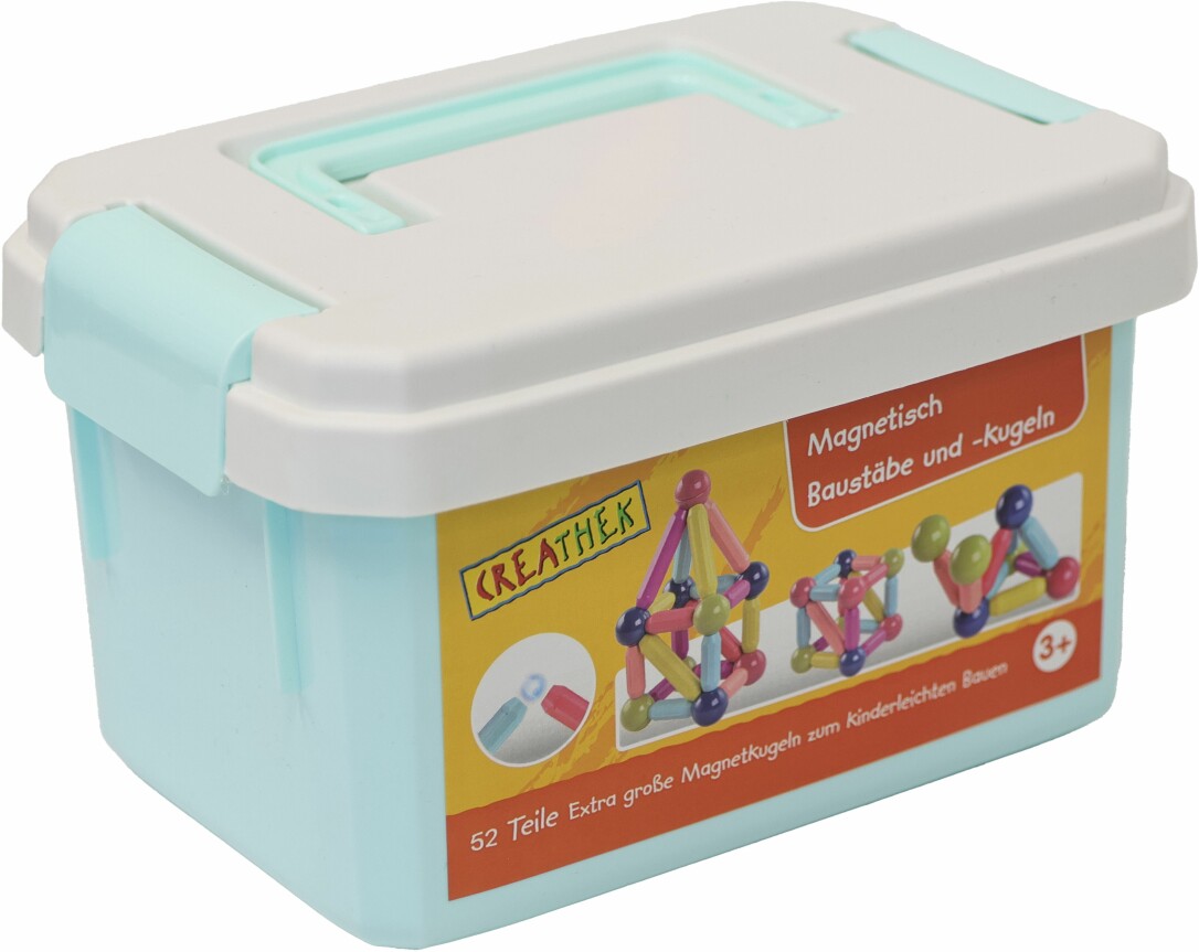 Creathek Magnetische Bau Stäbe und Kugeln. Bestehend aus 52 Teile. An den Enden der Bau Stäbe sind Magnete angeordnet, die sich mit den Stangen und Kugeln verbinden lassen. In einer praktischen Aufbewahrungsbox. Maße ca. 20,5x14,5x12,5 cm. Für Kinder ab 3 Jahren.