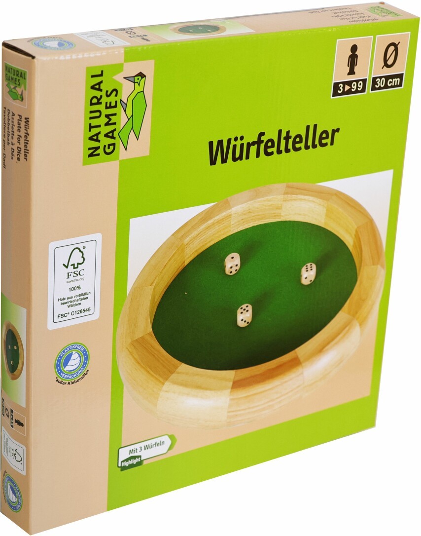 Natural Games Würfelteller, Durchmesser ca. 30 cm. Inklusive 3 Würfel. Maße Würfel ca. 1,6x1,6x1,6 cm. Für Kinder ab 3 Jahren.