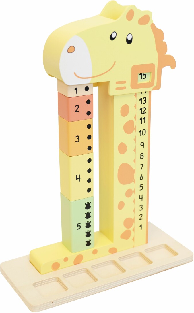 SpielMaus Holz Rechenschieber im Giraffendesign. Wenn der Kopf der Giraffe nach unten geschoben wird, bleibt er auf dem oberen Block stehen und die Summe der Zahlen wird angezeigt. Verschieden Zahlenkombinationen können addiert oder subtrahiert werden in dem die Blöcke gestapelt oder entfernt werden. Inklusive 5 Rechenblöcke. Maße ca. 28x12x30 cm. Für Kinder ab 3 Jahren.