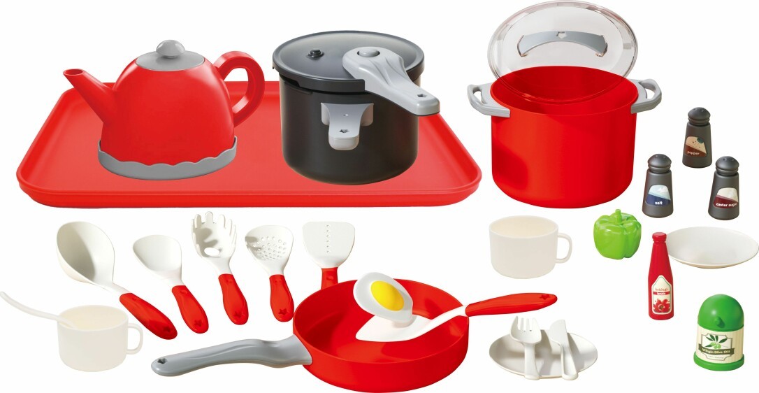 Das Kochtopf Spiel-Set 28-teilig, besteht aus einem Wasserkessel, einem Schnellkochtopf, einem Topf, einer Pfanne, sowie verschiedene Kochutensilien. Aus hochwertigem Kunststoff. Für Kinder ab 3 Jahren.