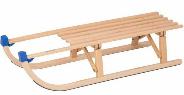 Klapprodel Davos 100cm aus Buchenholz, Bockstützen und Kufen aus gebogenem Sperrholz, lackiert, pulverbeschichtete Metallkufen mit abgerundetem Profil und Schutzkappen aus Kunststoff. Patentiertes Modell. Ab 5 Jahren. Max. Gewicht: 80kg.