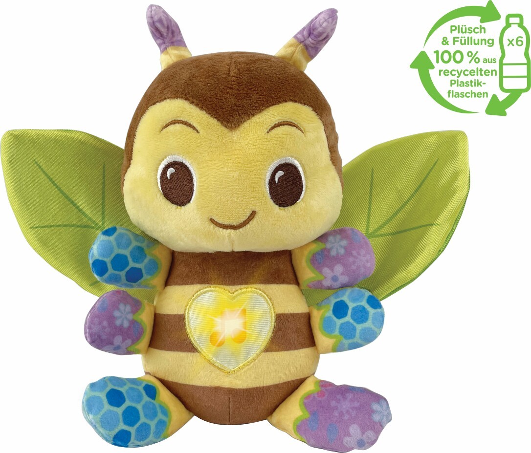 Summ, summ, summ, Bienchen summ herum! Süße Plüschbiene zum Kuscheln und Liebhaben, die aus nachhaltigem Material hergestellt wird. 100 % recycelter Plüsch auf Basis recycelter Plastikflaschen hergestellt (6 Flaschen pro Biene). Schont die fossilen Ressourcen der Erde. Flügel aus Knistermaterial fördern die sensorische Wahrnehmung. Die verschiedenen Stoffarten (Velour, Jersey, Satin) regen den Tastsinn an. Biene kann als Handpuppe verwendet werden: Die Hände können von hinten in die Flügel gesteckt werden, sodass die Biene mit den Flügeln schlägt. Die leuchtende Herztaste auf dem Bauch der Biene blinkt in zwei verschiedenen Farben und löst tolle Sätze, Geräusche und Musik aus. Die elektronische Einheit kann herausgenommen werden, sodass die Biene ganz einfach gewaschen werden kann (maschinenwaschbar). 2 gesungene Lieder und 30 Kindermelodien. Lautstärkeregler, kindersicheres Batteriefach und Abschaltautomatik . Demobatterien enthalten