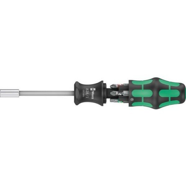 Wera Kompaktwerkzeug mit mehrkomponentigem Kraftform Griff für hohe Arbeitsgeschwindigkeiten und besonders ergonomisches Verschrauben. Im Griff integriertes Bit-Magazin, 6 Bits mit Torsionzone zur Vermeidung des Verwindens der Bit-Spitze bei hohen Belastungen. Dadurch signifikante Erhöhung der Produktlebensdauer. Mit Werkzeugfinder Take it easy: Farbkennzeichnung nach Profilen und Größenstempelung. Bithalter mit starkem Dauermagnet für sicheren Sitz des Bits.