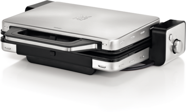 Kontaktgrill, 2in1 Lono, ist ein dekorativer Kontakt- und Tischgrill in einem Gerät. Der WMF Lono Kontaktgrill 2in1 fungiert als geschlossener Kontaktgrill wie auch als großer, aufklappbarer Tischgrill. Einzigartig ist die Vario-Flex-Grillplatte. Sie passt sich optimal dem Grillgut bei unterschiedlichen Höhen an. Spareribs und Gemüse können jetzt parallel zubereitet werden - die Grillplatte ist so flexibel aufgehängt, dass sie immer optimal auf dem Grillgut liegt. Das Lieblingsessen gelingt damit garantiert und ist obendrein noch fettarm und gesund. Denn dank Antihaftbeschichtung ist weder Öl noch Fett zum Grillen notwendig.