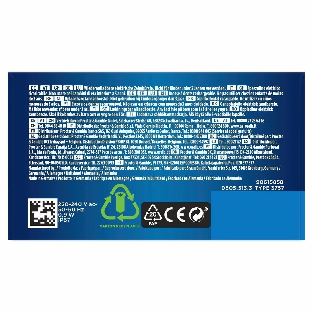 Überprüfen Sie regelmäßig das gesamte Produkt/Kabel/Zubehör auf Schäden. Beschädigte oder nicht funktionstüchtige Geräte dürfen nicht mehr benutzt werden. Falls das Produkt/Kabel/Zubehör beschädigt ist, bringen Sie es in ein Oral-B-Servicecenter. Nehmen Sie keine Veränderungen an dem Produkt vor und reparieren Sie es nicht. Dies kann zu Feuer, Stromschlag oder Verletzungen führen. Benutzung durch Kinder unter 3 Jahren ist nicht empfohlen. Personen mit eingeschränkten physischen, sensorischen oder geistigen Fähigkeiten oder fehlender Erfahrung bzw. fehlendem Wissen sowie Kinder können die Zahnbürsten dann benutzen, wenn sie beaufsichtigt werden oder Anweisungen zum sicheren Gebrauch des Geräts erhalten haben und die vorhandenen Gefahren kennen. Reinigung und Wartung dürfen nicht von Kindern durchgeführt werden. Kinder dürfen nicht mit dem Gerät spielen. Nutzen Sie dieses Produkt nur wie in der Gebrauchsanweisung beschrieben. Nutzen Sie kein Zubehör, das nicht vom Hersteller empfohlen ist.