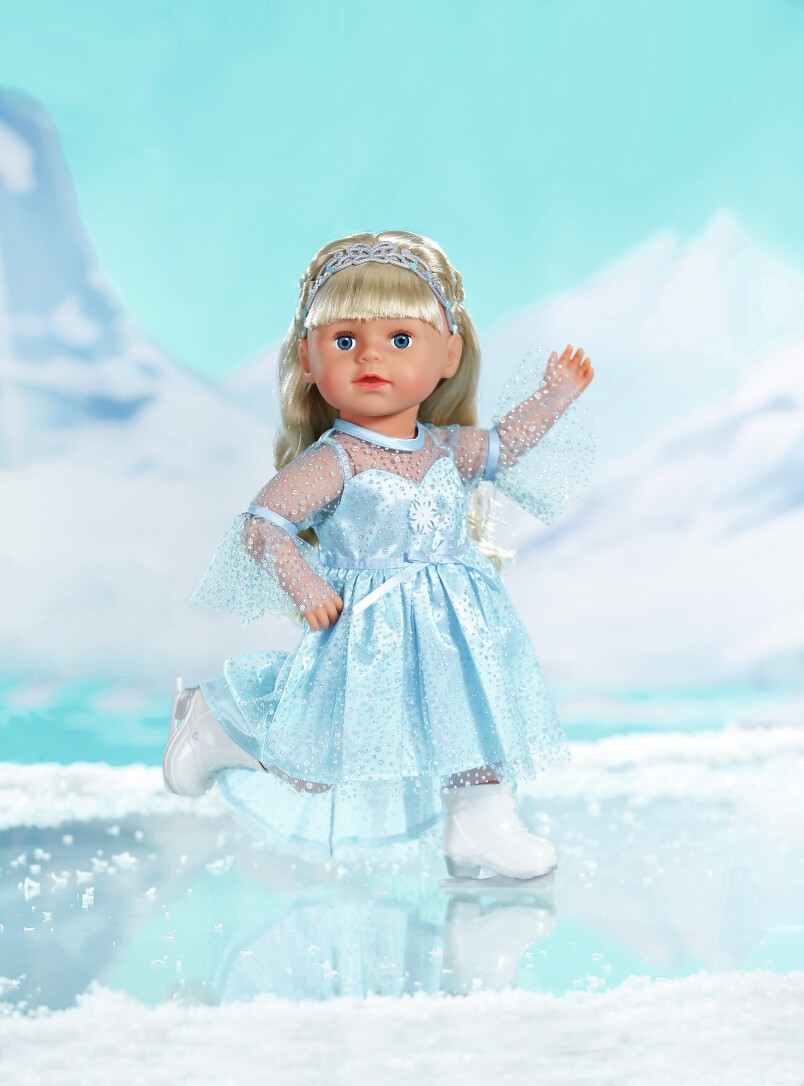 BABY born sieht in diesem wunderschönen Eisprinzessinnenkleid einfach umwerfend aus. Mit ihren Schlittschuhen kann sie sich sogar am Eiskunstlauf versuchen. Dabei macht sie eine gute Figur weil im Rampenlicht sogar ihr Kleid ganz zauberhaft glitzert. Inkl. Schuhen, Kleid und Glitzerkrone.