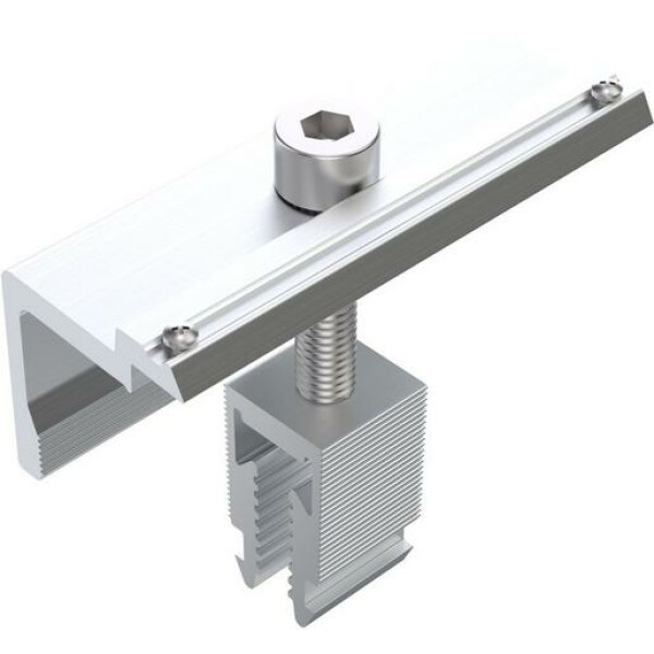 Modul-Endklemme für Rahmenhöhe 30-46 mmKlick-Sockel für einfache und schnelle MontageErdungs-Pins für Potenzialausgleich Rahmen-GestellLänge: 80 mm, komplett vormontiertMaterial: Aluminium EN AW-6063 T66, rostfreier Stahl A2-70