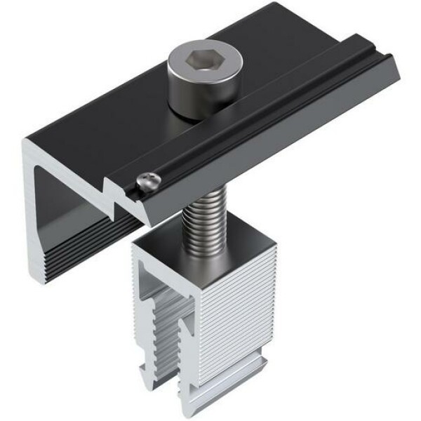Modul-Endklemme für Rahmenhöhe 30-46 mm, schwarz eloxiertKlick-Sockel für einfache und schnelle MontageErdungs-Pin für Potenzialausgleich Rahmen-GestellLänge: 60 mm, komplett vormontiertMaterial: Aluminium EN AW-6063 T66, rostfreier Stahl A2-70
