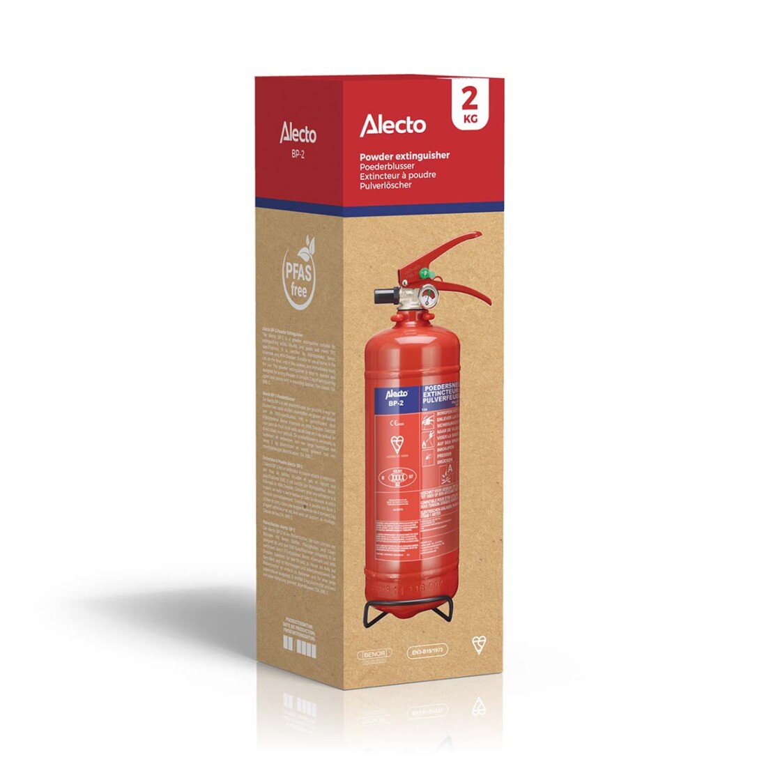 Technische Daten• Typ: BP-2 • Löschmittel: • Pulver Inhalt: 2 kg • Farbe: Rot • Druck: 15 bar • Material: Stahl • Entspricht EN3Blus • Qualität 13A 89B CTipps & Tricks • Der Pulverlöscher löscht alle Brände von Feststoffen, Flüssigkeiten und Gasen • Der BP-2 erfüllt alle wichtigen Zertifikate (Staatliche Typgenehmigung, Benor und Kitemark zertifiziert) • Achten Sie darauf, dass der Alecto-Löscher außer im Haus auch im Auto, in der Garage, im Wohnwagen und auf dem Boot vorhanden ist • Die einfache Bedienung sorgt dafür, dass Sie bei einem Brand sofort in Aktion treten können • Eine lange Lebensdauer des Feuerlöschers ermöglicht es Ihnen, ihn nach einem Brand wieder zu verwendenBefestigen Sie die mitgelieferte Halterung an der Wand, so dass der Feuerlöscher in Reichweite aufgehängt werden kann.Abmessungen, Gewicht und Höhe:• Höhe: 40,5 cm • Durchmesser: 12,5 cm • Gewicht: 3,722 kgWas ist im Karton?Pulverlöscher Aufhängevorrichtung Niederländisches, deutsche und französisches Handbuch auf dem Feuerlöscher