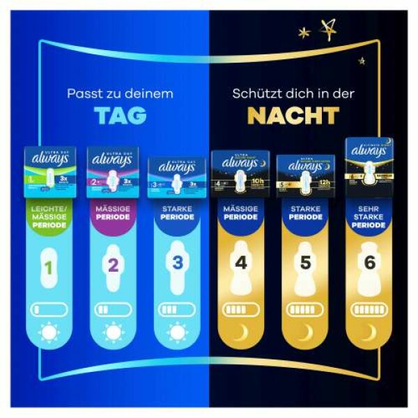 Erlebe außergewöhnlichen Schutz mit ALWAYS Ultra Mässige Periode (Größe 1) Damenbinden. Die einzigartige Smart Contour-Technologie ermöglicht es der Binde, sich eng an den Körper anzupassen, Blut direkt an der Quelle aufzufangen und keine Lücken für das Austreten von Blut zu lassen, wodurch du vor Auslaufen geschützt wirst. Zusätzlich absorbiert die weiche Oberfläche das Blut in Sekunden und sorgt für ein trockenes und sauberes Gefühl den ganzen Tag über, während die OdourLock-Technologie Gerüche neutralisiert und für ganztägige Frische sorgt. Wähle Always Ultra für nahezu kein Körperabstand, kein Auslaufen und keine Nässe. Für zusätzlichen Schutz in der Nacht probiere Always Night Größen.