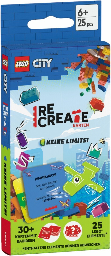 ''Mehr Bauherausforderungen warten! Mit den LEGO® ReCreate Karten werden LEGO Fans und Neulinge erneut auf die Probe gestellt. Über 30 Aufgaben müssen mit den beigelegten LEGO Elementen gemeistert werden und stellen die eigene Fantasie auf die Probe. ? Über 30 Karten mit Bau- und Spielideen aus der unbegrenzten LEGO City - Welt fordern dich heraus, mit den enthaltenen 25 LEGO Elemente kreativ zu werden. Sowohl LEGO Begeisterte als auch neue Fans haben die Möglichkeit, diese Themenwelt fantasievoll zu gestalten. Die bunten Karten bieten Aufgaben auf unterschiedlichen Niveaus, ergänzen Bestehendes oder stellen das Gebaute auf den Kopf. Egal ob allein oder gemeinsam, unterwegs oder zu Hause - Spaß und Wiederspielwert sind garantiert. Die LEGO Re Create - Karten sind für Kinder ab 6 Jahren geeignet.''
