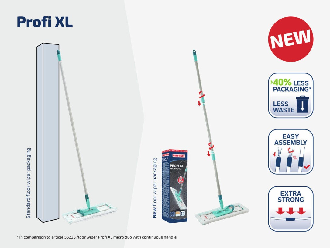 Schluss mit Rückenschmerzen beim Putzen und unschönen Schlieren. Der Leifheit Profi XL micro duo beseitigt mit seinem speziellen 2-Faser-Wischbezug bis zu 99 % der Viren und Bakterien* und lässt sich ganz bequem per Fuß bedienen. So sieht der ideale Bodenwischer für große Flächen, wie Küchen oder auch Büroräume, aus.