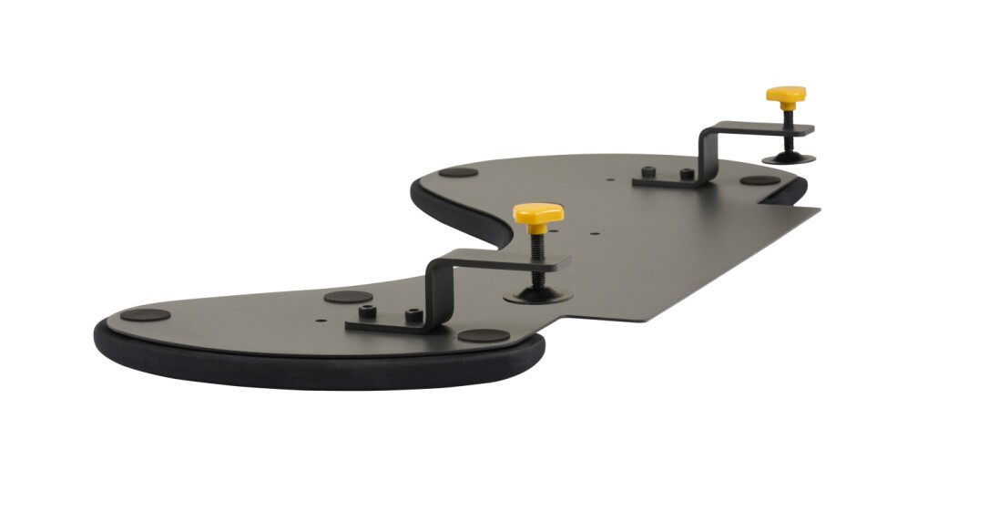 BakkerElkhuizen ErgoSlider+ Underarm Support Asymmetrical. Produktfarbe: Schwarz, Dunkles Grau, Gelb, Material: Spanholzplatte, Kunststoff, Polyurethan (PU), Stahl, Befestigungsart: Clamp attachment. Breite: 310 mm, Tiefe: 665 mm, Höhe: 80 mm. Menge pro Packung: 1 Stück(e), Verpackungsbreite: 310 mm, Verpackungstiefe: 690 mm. Palettengewicht (brutto): 350 g, Anzahl Produkte pro Versandkarton: 5 Stück(e), Produkte pro Palette: 100 Stück(e)