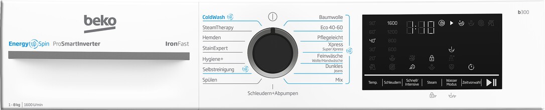 | Max. Schleuderdrehzahl beim Standardprogramm Baumwolle 60 °C | 1600 Upm |