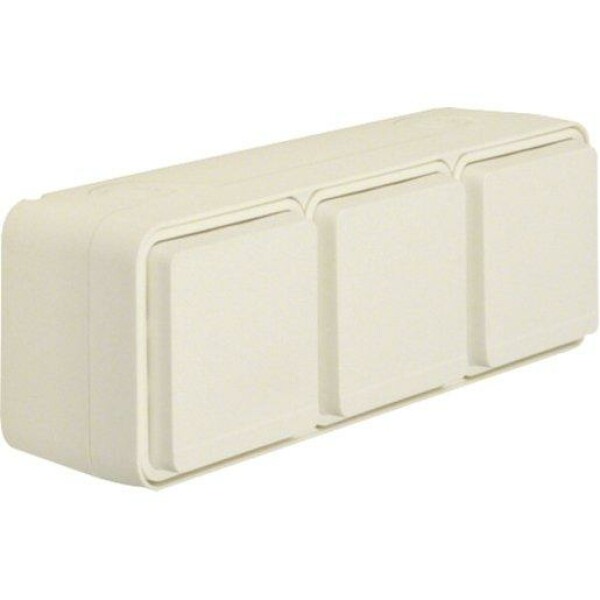 Steckdose SCHUKO 3-fach waagerecht m Klappdeckel Aufputz vorverdrahtet, mit Leitungseinführung für 2 Kabel und Leitungseinführung für Kabel oder Rohr, Gehäuseschrauben aus Edelstahl Rostfrei, mit Wago 2-Leiter Verbindungsklemme, zusätzliche Wago 2-Leiter Verbindungsklemme für Verdrahtung einrastbar.