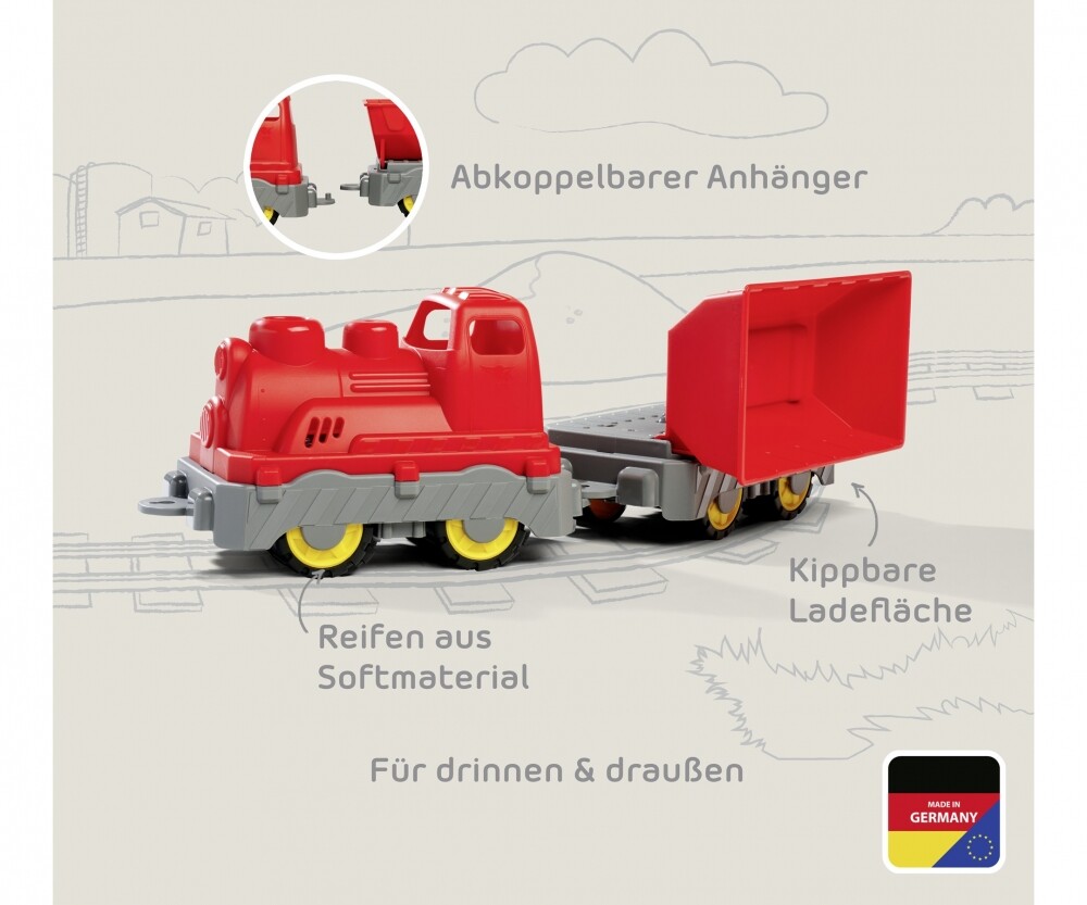 Der zweiteilige Zug (45 x 12 x 14 cm) der BIG Power Worker Fahrzeuge für Kleinkinder ab 2 Jahren besteht aus einer detailgetreuen Lokomotive und einem Kippwagen! Wie mit einem Kipplaster können Kinder mit dem großen Anhänger Sand und Gegenstände transportieren - und dabei ihre motorischen Fähigkeiten trainieren!