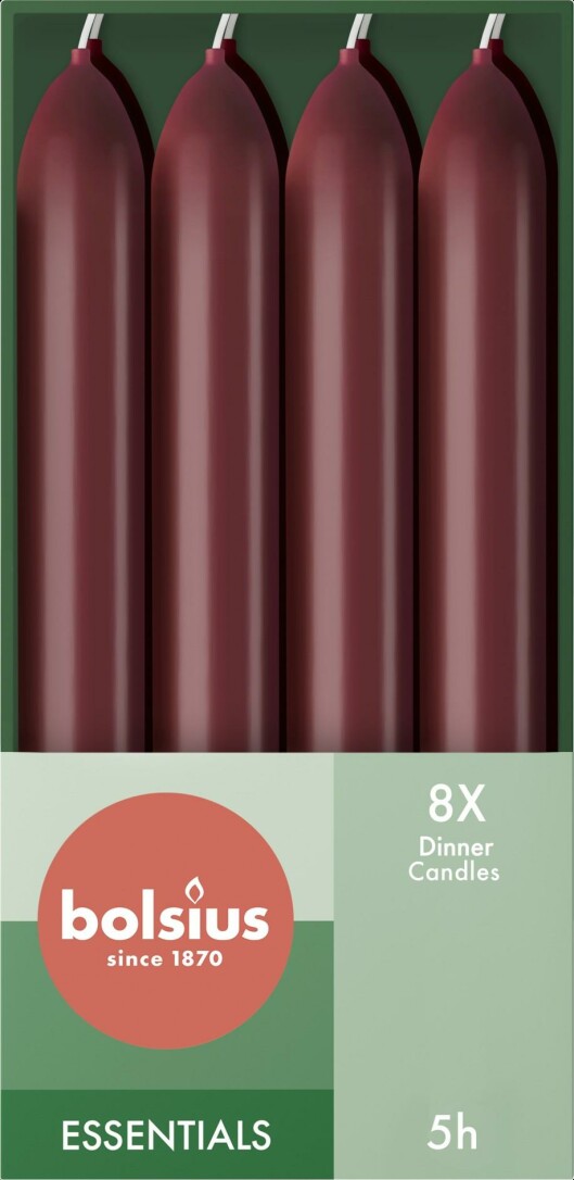Tafelkerzen 8er Pack. Paraffinmischung, Brenndauer ca. 5 Stunden (die Brenndauer ist nur bei bestmöglichen Verhältnissen gewährleistet). Farbe: samtrot. Maße: Ø 2 cm, H 17,6 cm.