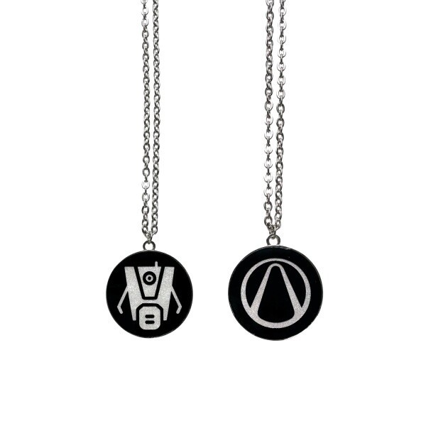 Dieser silberfarbene Anhänger mit Perleffektmaterial zeigt auf der einen Seite Claptrap, den beliebten Roboter aus Borderlands und auf der anderen das kultige Vault-Symbol.