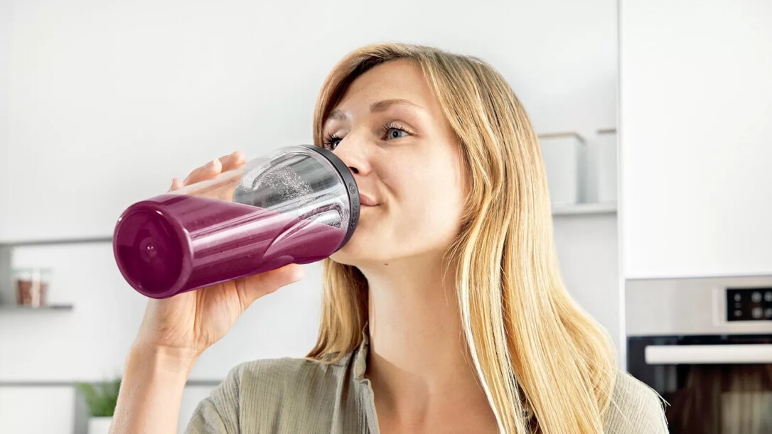 Mixen Sie Ihren Smoothie direkt in der Tritan ToGo-Flasche und nehmen Sie ihn mit. Sie können Smoothies mit gefrorenen Früchten, Milchshakes oder Eiweißdrinks zubereiten.