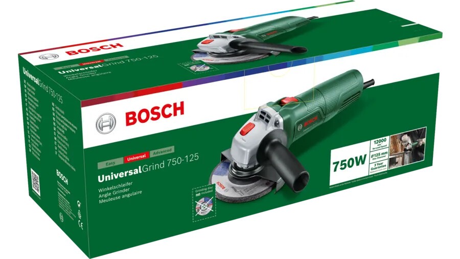Bosch UniversalGrind 750-125. Produktfarbe: Schwarz, Grün, Motortyp: Bürstenloser Motor. Schleifscheibendurchmesser: 12,5 cm, Leerlaufdrehzahl (max.): 12000 RPM. Energiequelle: AC, Eingangsleistung: 750 W. Gewicht: 1,9 kg, Breite: 72 mm, Höhe: 102 mm
