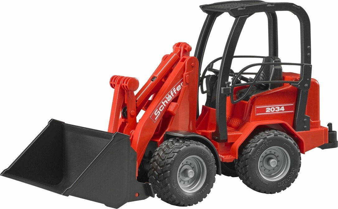 For over 50 years Schäffer has been developing articulated road loaders for agricultural, landscaping and gardening purposes. The compact series 2000 is one of Schäffer's most successful model series of all times. Maximum output in confined spaces, that is this loader's maxim. This pivotal and convincingly versatile vehicle enabling success in agriculture has now been added to the Bruder collection at a scale of 1:16. The vehicle features operational articulated joint steering and the loading arm as well as the bucket are also operated just like in the original. Solid anti-roll bars protect the bworld figure that comfortably fits into the driver's seat. Accessories set #02318 (not within the scope of delivery) can be attached to the loader to enhance the playful experience.