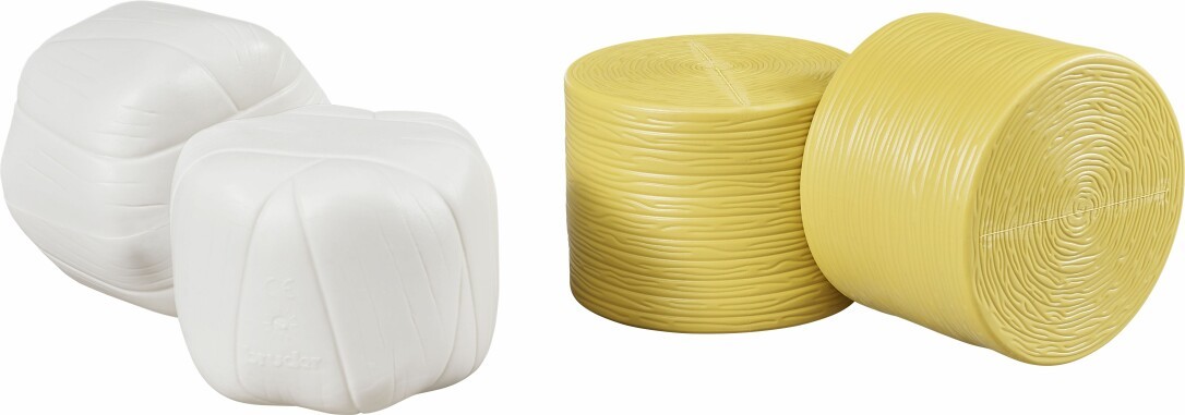Die vier sortieren Rundballen, je zwei Stück gewickelt (schwarz) und ungewickelt (ockerbraun) passen für den Ballenwickler, Art.-Nr.: 02122 (nicht im Lieferumfang enthalten).