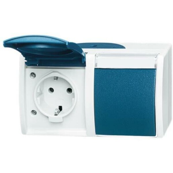 Busch-Jaeger 2084-0-0703. Socket type: CEE 7/3, Number of poles: 2P+E. Product colour: Blue,White, International Protection (IP) code: IP44. Rated voltage: 250 V, Rated current: 16 A. Width: 145 mm, Depth: 55 mm, Height: 83 mm