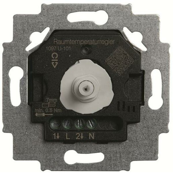 Der elektronische Raumtemperaturregler-Einsatz mit Drehregler dient der Ansteuerung von Warmwasserheizungen und ist für den Einbau in Unterputzdosen nach DIN 49073 vorgesehen. Er verfügt über einen potentialgebundenen Wechselkontakt, der automatisch umschaltet, sobald die eingestellte Temperatur erreicht ist. Für den Anschluss eines stromlos offenen Stellventils wird der Öffnerkontakt genutzt, der für einen Nennstrom von 10 A ausgelegt ist. Bei einem stromlos geschlossenen Ventil kommt der Schließerkontakt zum Einsatz, der für 5 A bemessen ist. Die volle Schaltpunktgenauigkeit erreicht das Gerät etwa ein bis zwei Stunden nach der Inbetriebnahme. Der Einstellbereich beginnt bei 5 °C.