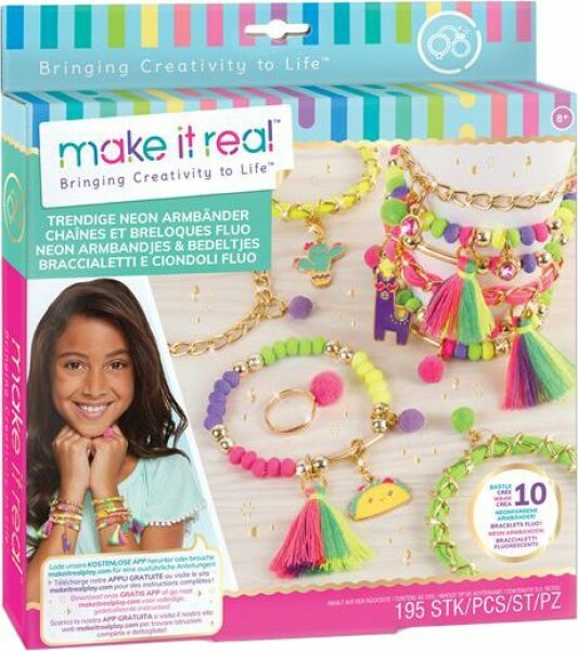 Set zum Herstellen von Neon-Armbändern. Inhalt: 164 verschiedene Perlen, 3 einzigartige Anhänger, 3 Troddel, 6 Bommelanhänger, 3 Edelsteinanhänger, 6 elastische Stoffschnüre # 25 cm (2 rosa, 2 gelb, 2 grün), 5 Stück goldene Panzerkette, 1 verstellbarer Ring, 1 rosa Bommel, 1 Basteltablett und Anleitung.