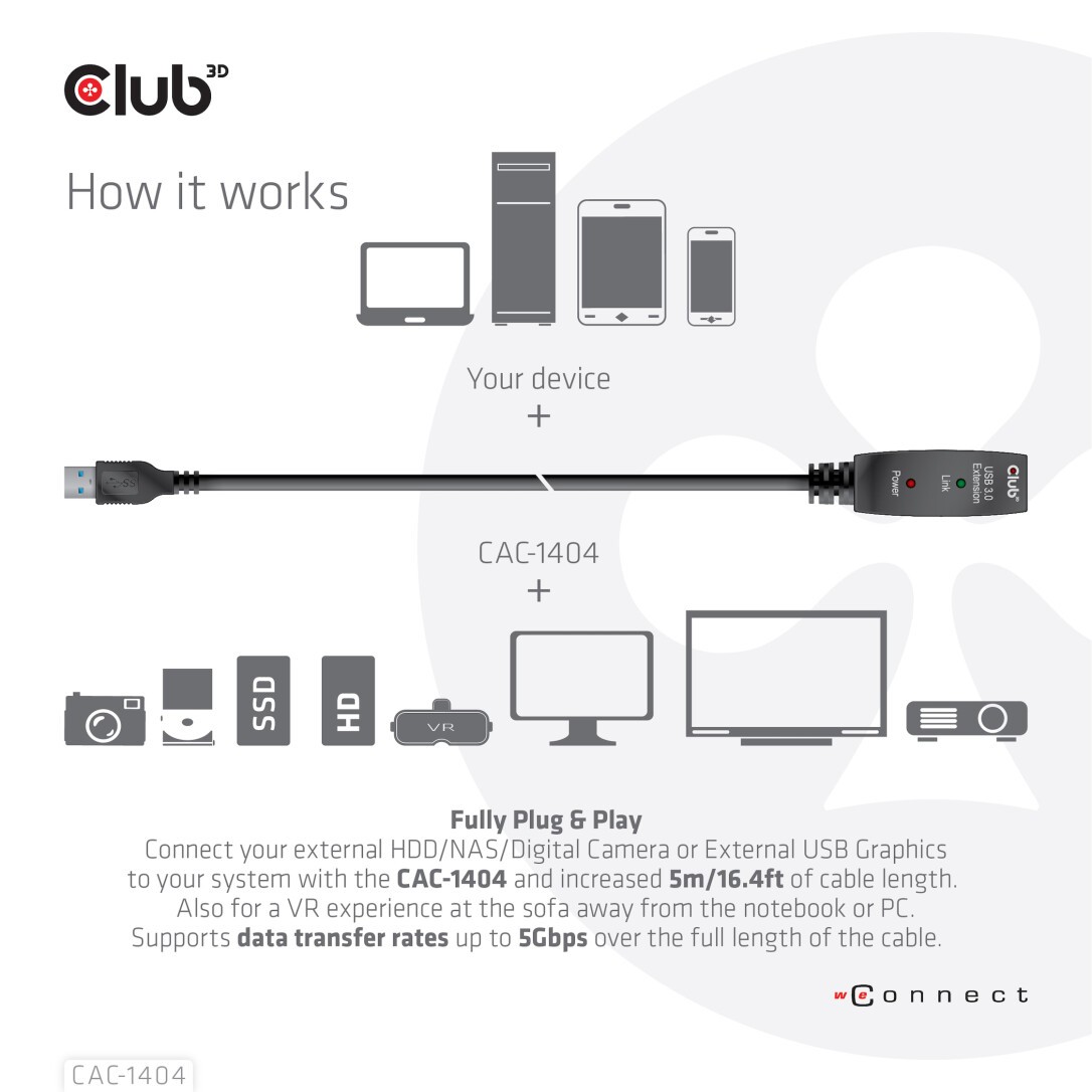 With this Club3D USB 3.2 Gen1 Active Repeater Cable CAC-1404, you can go far beyond the standard USB Cable length limitation of 3 meters /9.84 feet, without loss of Data Transfer Speed. The USB 3.2 Gen1 Active Repeater Cables are fully Plug & Play and do not require any driver installation. Just connect your external USB device like External HDD/NAS/Digital Camera or External USB Graphics to your system with the CAC-1404 and have flexibility of the increased 5 meters /16.4 feet of extra cable length. Also for a VR experience at the sofa away from the notebook or PC this cable provides you with the freedom of movement.