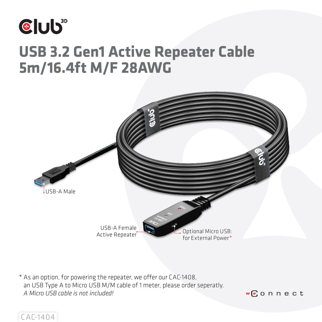 * A Micro USB cable for external power is not included. We advice the Club 3D CAC-1408: USB A to Micro USB cable of 1m / 3.28 ft. To be ordered additionaly.
