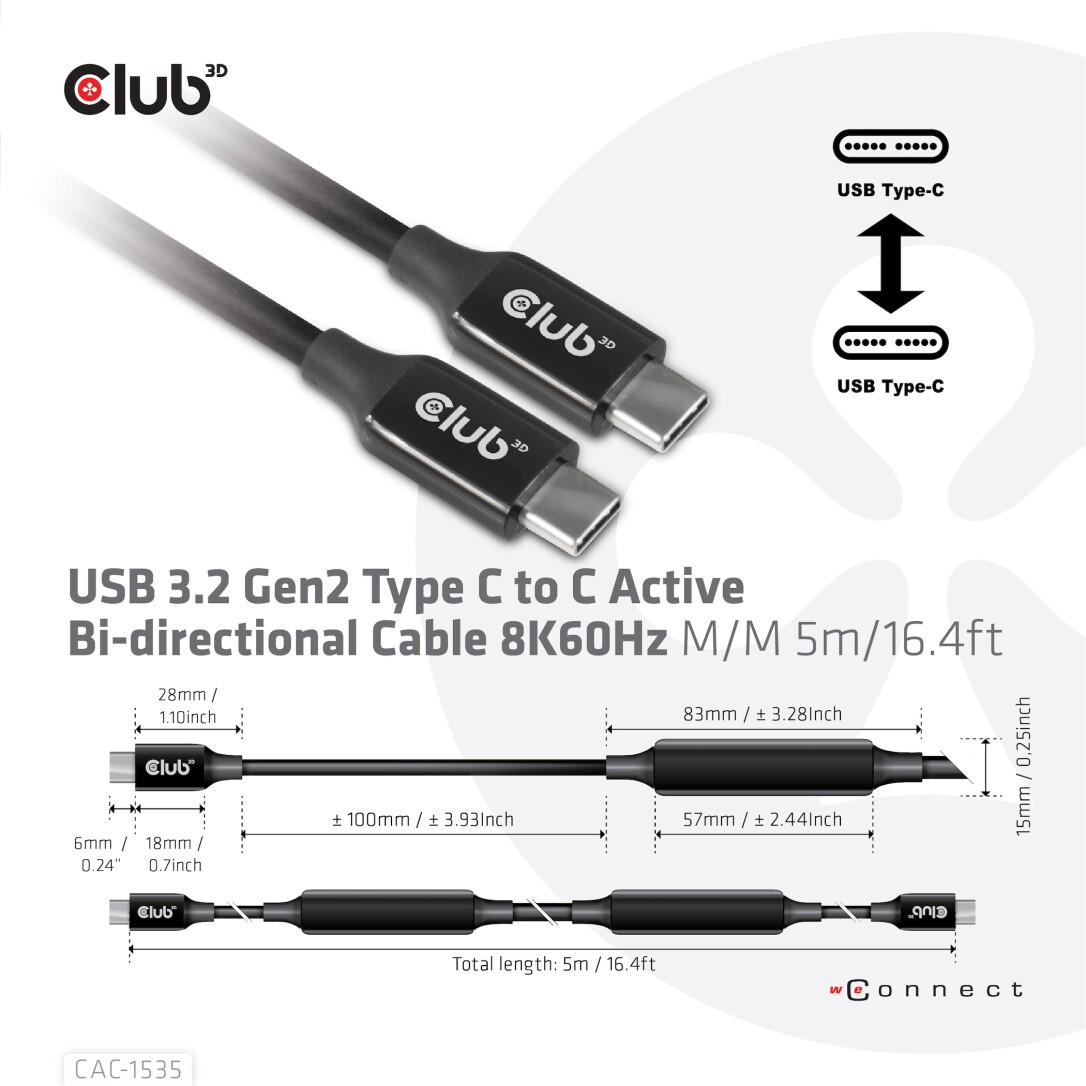 Club 3D USB 3.2 Gen2 Type C to C Active Bi-directional Cable 8K60Hz M/M 5m/16.4ft - 5 m - USB C - USB C - USB 3.2 Gen 2 (3.1 Gen 2) - 10000 Mbit/s - Black