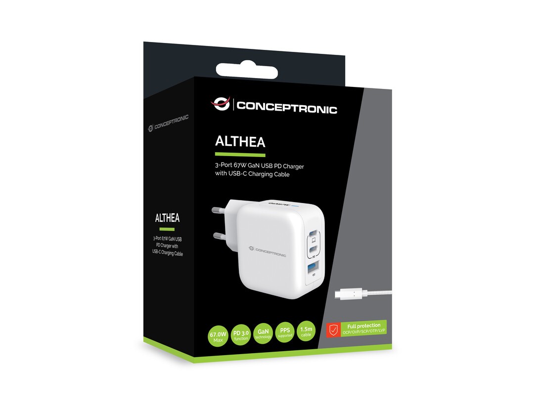 Conceptronic 3-Port 67W GaN USB-PD-Ladegerät mit USB-C-Ladekabel, USB-C x 2, USB-A x 1, QC 3.0, PPS. Aufladetyp: Drinnen, Energiequelle: AC, Aufladekompatibilität: Universal. Eingangsspannung: 100 - 240 V, Maximale Ausgangsspannung: 20 V. USB Typ-C Anzahl Anschlüsse: 2, Schnellladung, Energieschutzeigenschaften: Überhitzung, Überlastschutz, Kurzschluß. Kabellänge: 1,5 m, Produktfarbe: Weiß