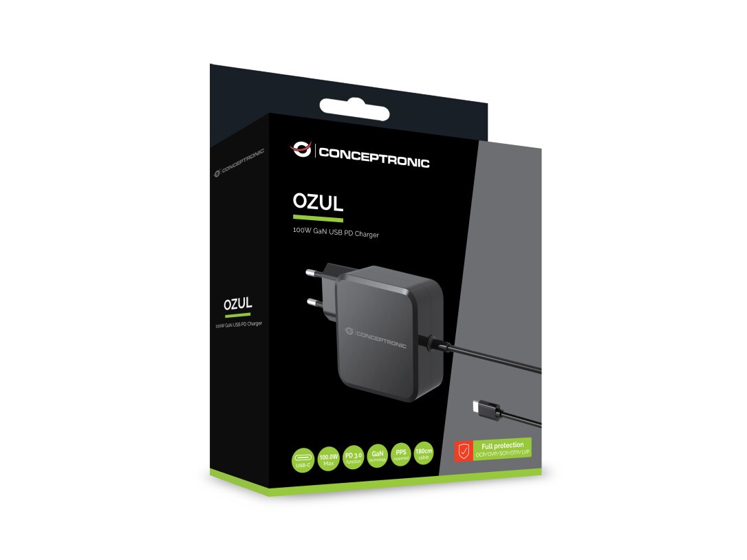 Conceptronic OZUL05BE 100W GaN USB-PD-Ladegerät, Eingebautes USB-C-Kabel. Aufladetyp: Drinnen, Energiequelle: AC, Aufladekompatibilität: Universal. Eingangsspannung: 100 - 240 V, Maximale Ausgangsspannung: 20 V. Energieschutzeigenschaften: Überhitzung, Überlastschutz, Kurzschluß. Kabellänge: 1,8 m, Produktfarbe: Schwarz