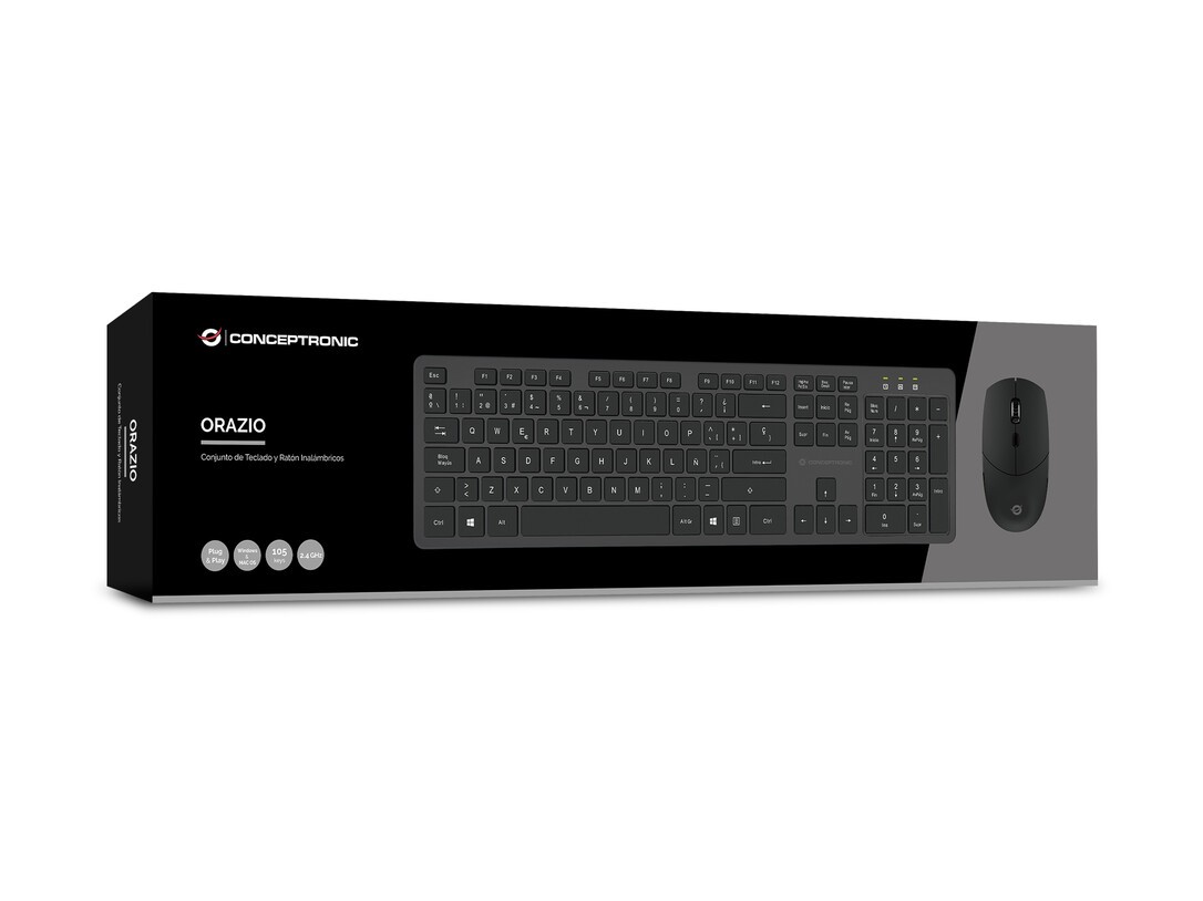 Conceptronic Kabellose Tastatur- und Maus-Kombination, Spanisches Layout. Tastatur Formfaktor: Volle Größe (100%). Tastatur-Stil: Gerade. Übertragungstechnik: Kabellos, Geräteschnittstelle: RF Wireless, Tastaturaufbau: QWERTY, Tastatur - Tastenanzahl: 105, Empfohlene Nutzung: Büro. Produktfarbe: Schwarz. Maus enthalten