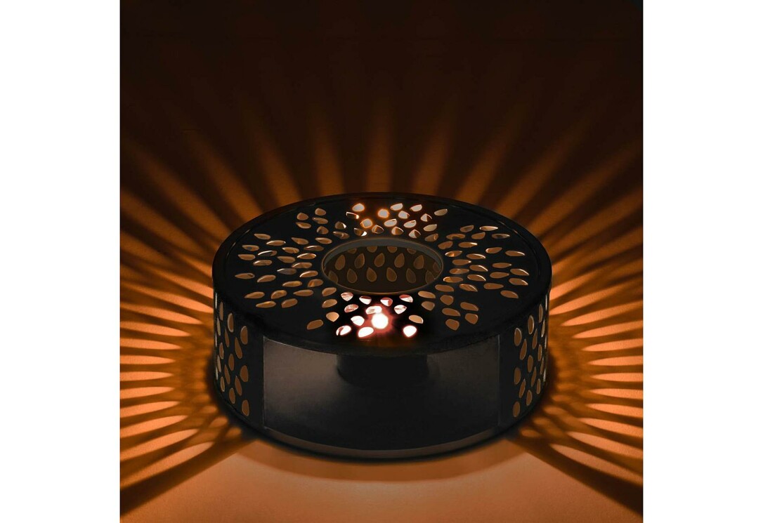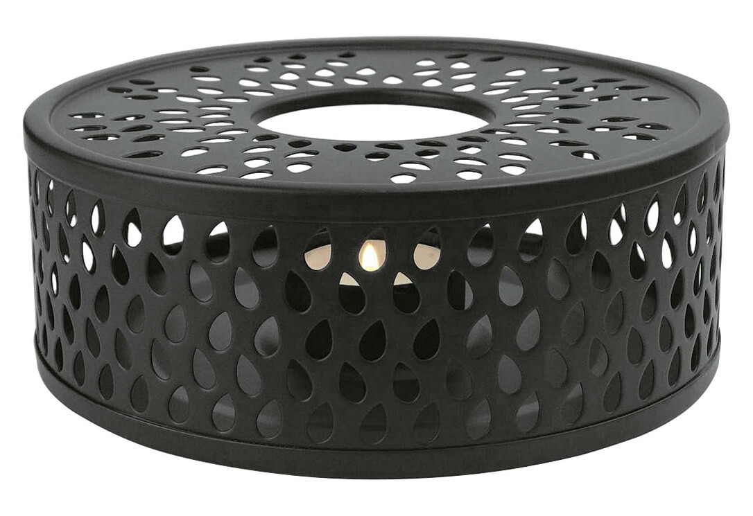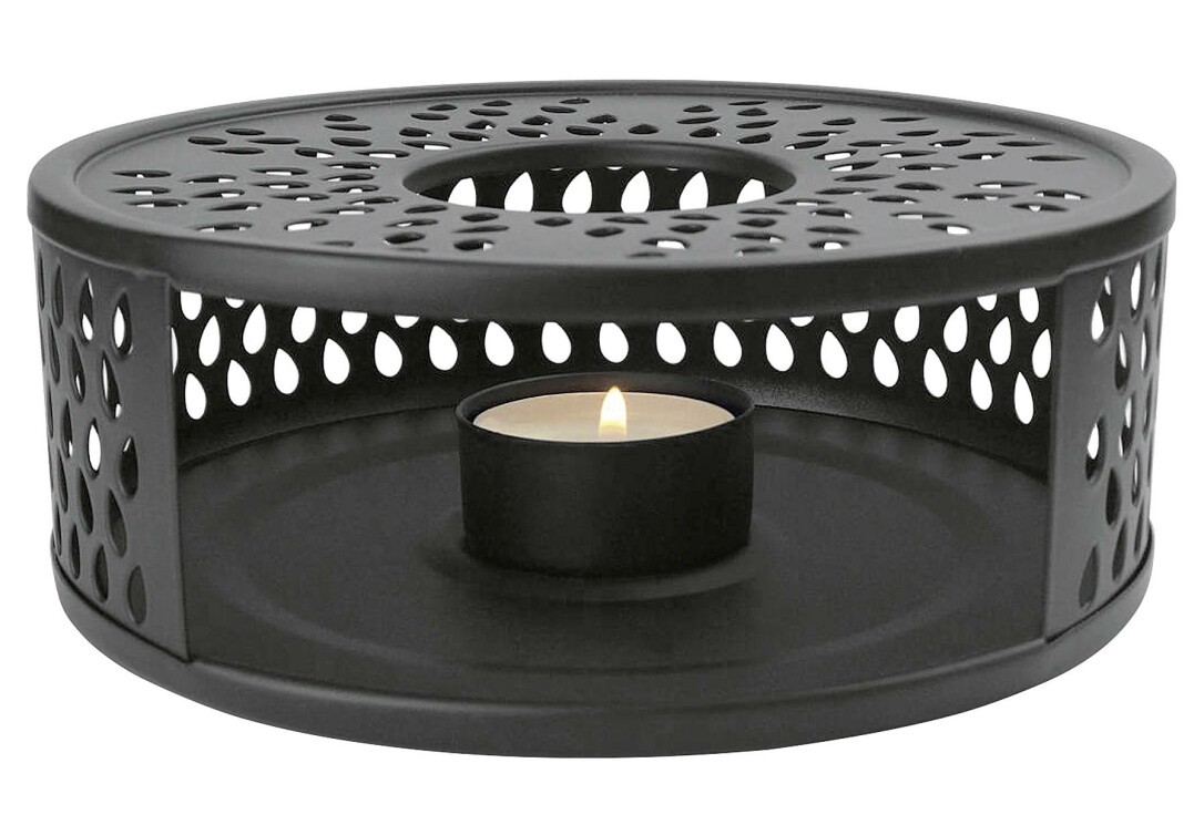 Stövchen "Leaf" aus Edelstahl mit Teelichteinsatz (Ø 4 cm), extra große Öffnung, 10,5 cm, zum bequemen herausnehmen des Teelichteinsatzes, für sämtliche Teekannen geeignet, spülmaschinengeeignet, kratz- und stoßfest. Farbe: schwarz. Sicherheitsmerkmal: kein Kontakt mit Lebensmitteln. Maße: Ø 15,5 cm, H 5,5 cm.