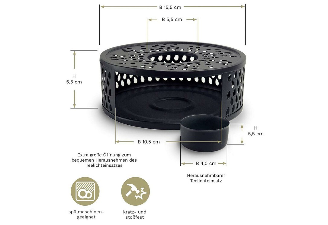 | Artikeleigenschaften | mit Teelichthalter | für sämtliche Teekannen geeignet | extra große Öffnung, 10,5 cm, zum bequemen herausnehmen des Teelichteinsatzes | spülmaschinengeeignet | kratz- und stoßfest |
