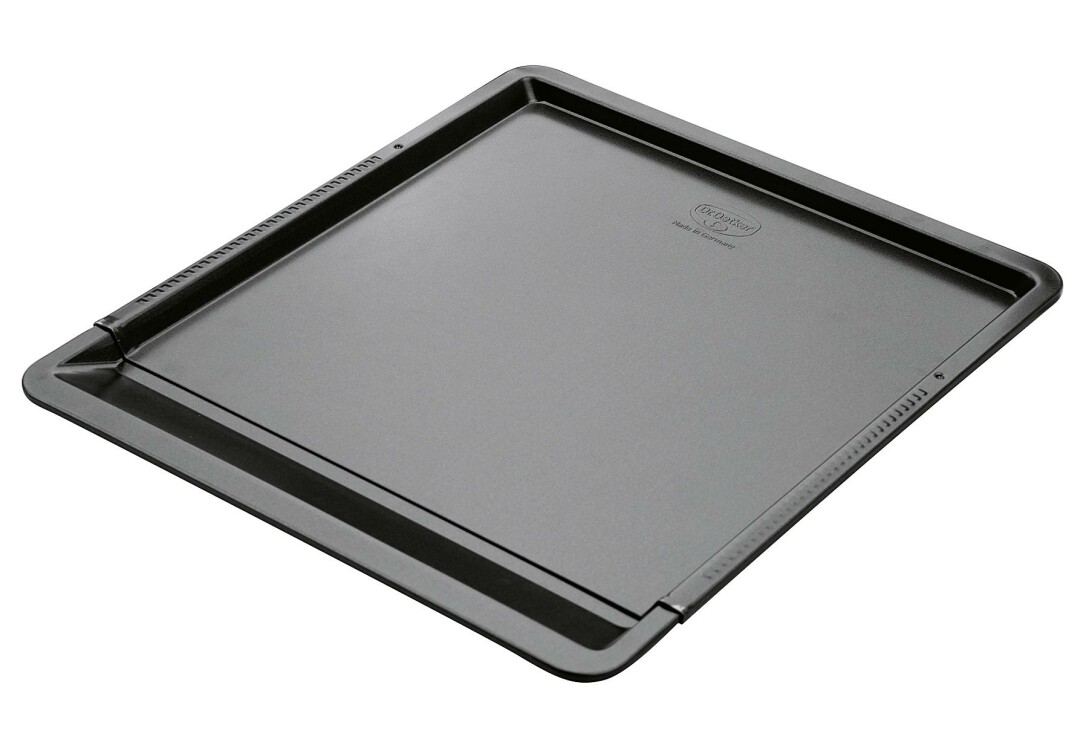 Back- und Plätzchenblech "Classic", Material: Stahlblech, mit PFAS-freier Antihaft-Beschichtung, Maße: (LxBxH): 33x52x1,5 cm, verstellbar von 37-52 cm, Farbe: schwarz.