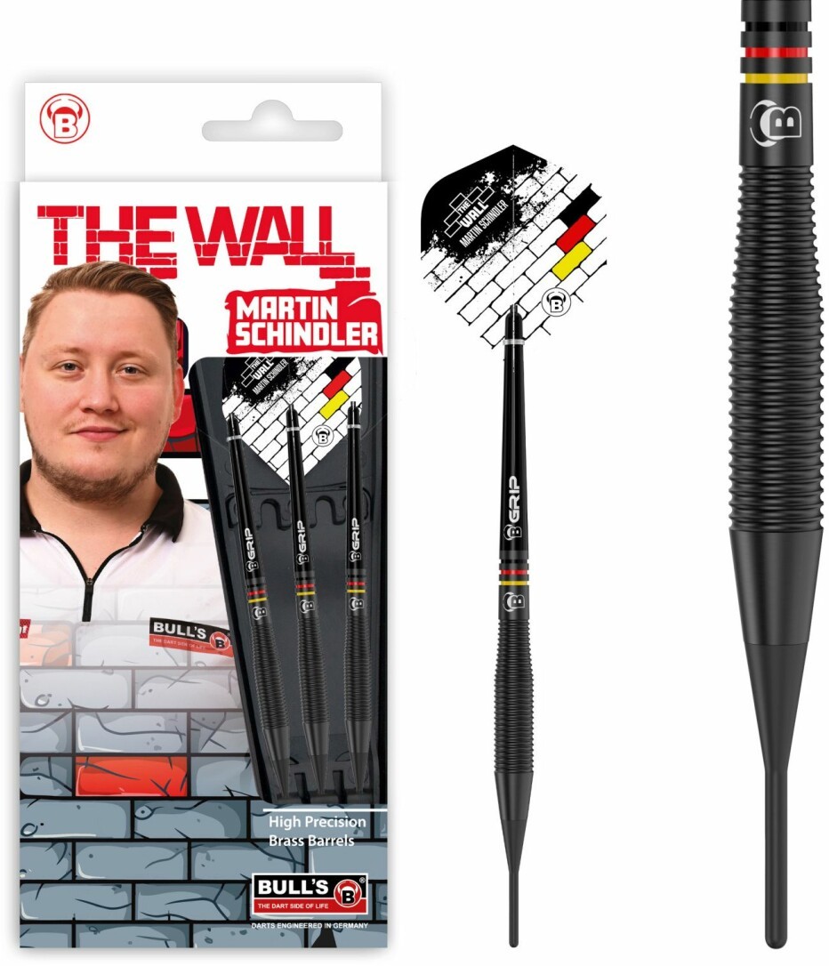BULL'S Martin Schindler Black Brass Softdart. Die Martin Schindler Brass Darts bieten die typische Form, die man von Martin Schindler kennt, und bestehen aus hochwertigem black coated Messing. Diese Darts sind ideal für Einsteiger, um Gewicht und Form des Darts kennenzulernen. Am Ende des Barrels befinden sich die letzten drei Ringe in den Farben der Deutschlandflagge. Abgerundet wird das Set durch einen schwarzen B-Grip2 Shaft und einen schwarz-weißen Flight mit Deutschlandflagge, der das Design perfekt ergänzt. Empfohlen für Kinder ab 8 Jahren.
