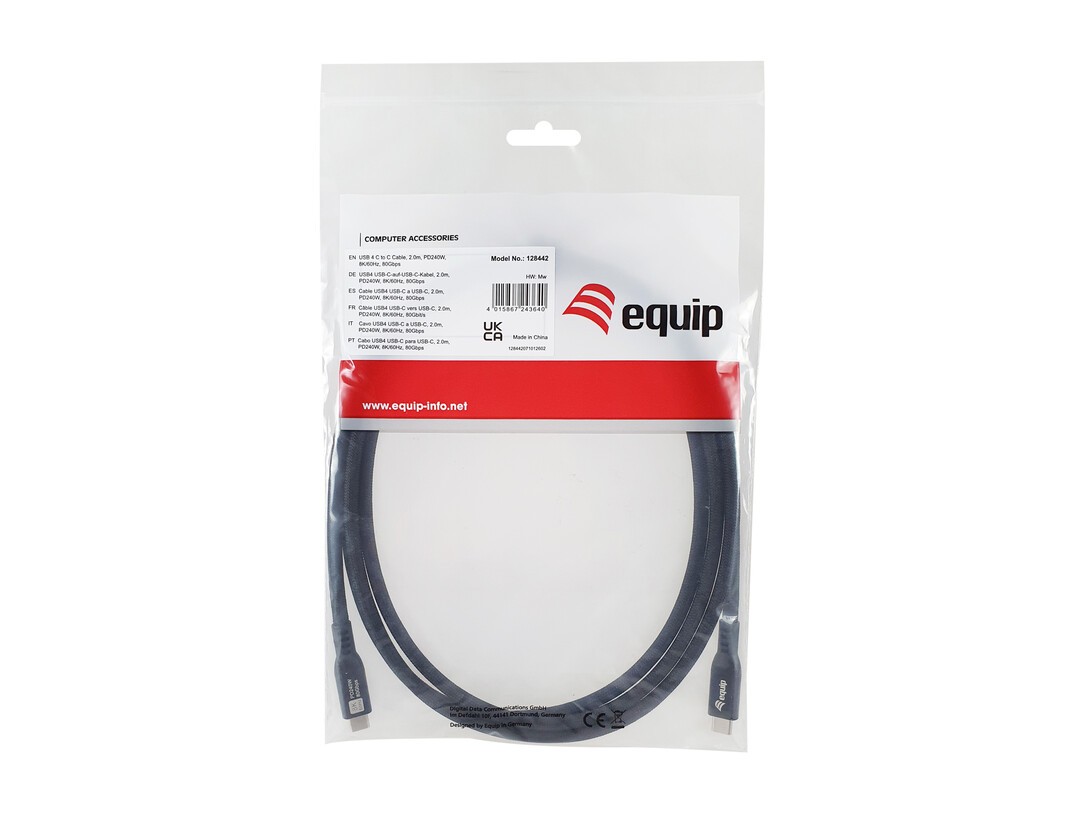 Equip USB 4 C auf C Kabel, 2m, PD240W, 8K/60Hz, 80 Gbit/s, Schwarz. Kabellänge: 2 m. Anschluss 1: USB C, Anschluss 2: USB C, USB-Version: USB4 Gen 4x2, Max. Datenübertragungsrate: 80 Gbit/s, Produktfarbe: Schwarz
