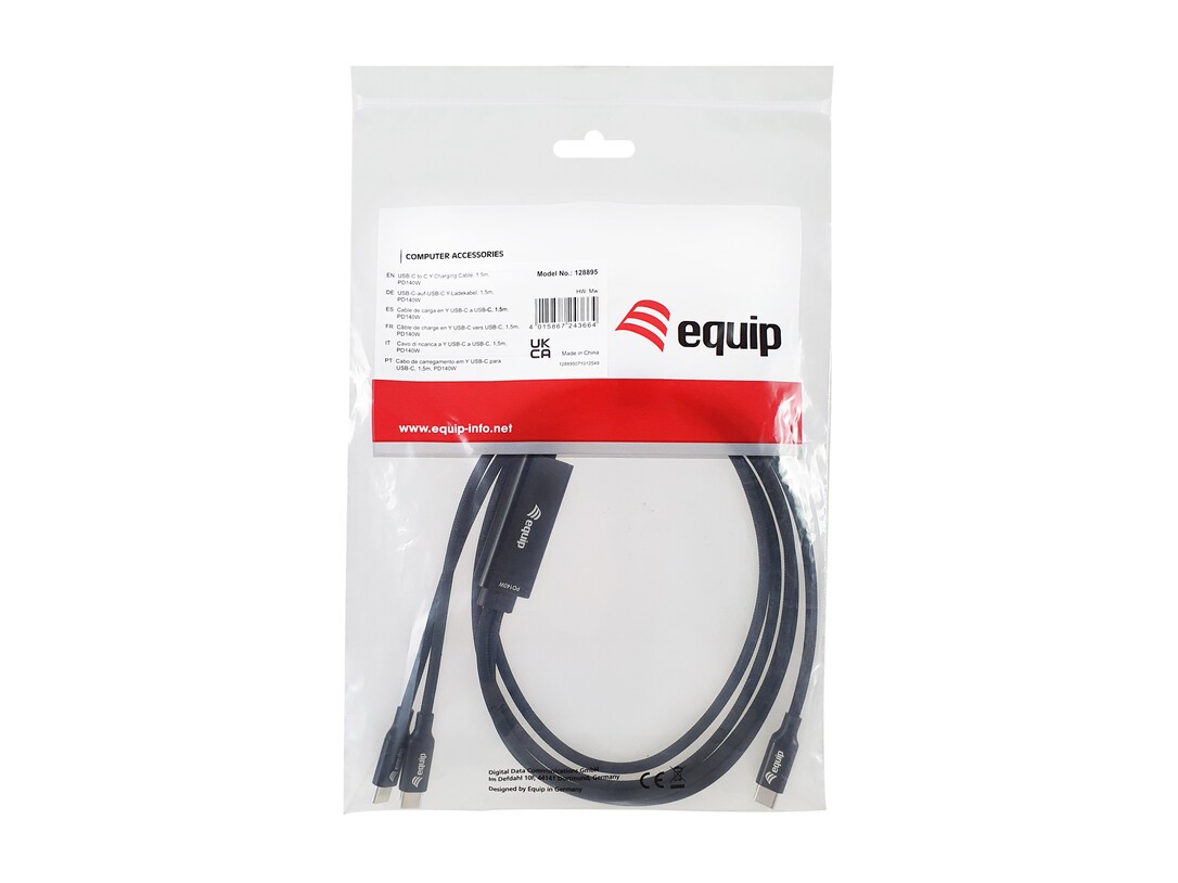 Equip USB-C-auf-C-Y-Ladekabel, 1.5m, PD 140 W, Schwarz, 1,5 m, USB C, 2 x USB C, USB 2.0, 0,48 Gbit/s, Schwarz
