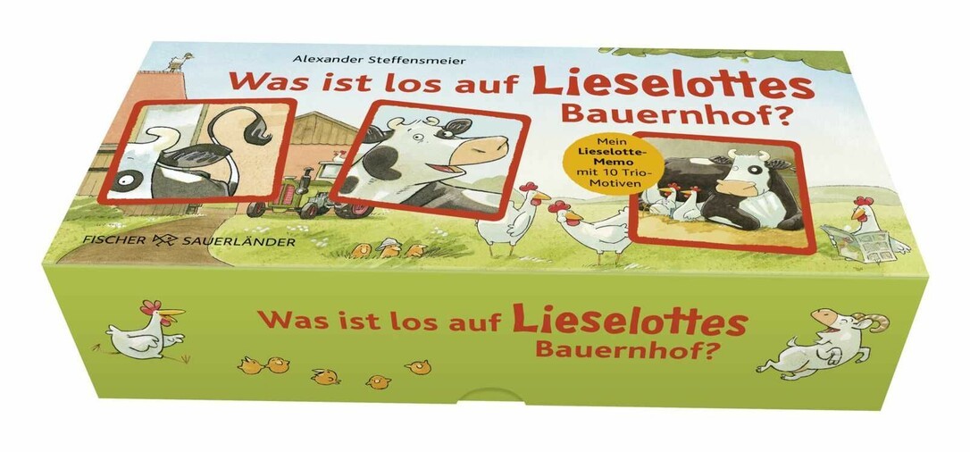 Lustiges Lieselotte-Memo-Spiel mit Trios statt Bild-Paaren für Kinder ab 4 Jahren Memo-Spiel mit 10 Trios zu Kuh Lieselottes Welt Ein Memo-Spielspaß für Kinder ab 4 Jahren In verschiedenen Schwierigkeitsgraden spielbar Spielen und Lernen zugleich: Das Lieselotte-Memo bietet Spielspaß, regt zum Knobeln an und macht Lust auf Lieselottes Welt. Was macht Lieselotte am liebsten? Richtig, Post austragen! Und wer sind Lieselottes Freunde? Richtig, die Schweine, die Ziege, das Pony und die vielen Hühner. Die Bäuerin und der Postbote gehören natürlich auch dazu. Das Memo mit je drei zusammengehörigen Bildern statt Bildpaaren ist eine echte Herausforderung für kleine und große Gedächtniskünstler und eine wunderbare Anregung zu überlegen, wer alles in Lieselottes Welt zuhause ist. Es kann alleine oder zu mehreren Spieler:innen gespielt werden, mit offenen oder verdeckten Spielkarten. Neben Ziege, Hund und Hühnern kommen alle Freunde von Lieselotte vor. Und damit es nicht gar so schwer wird, haben die zusammengehörigen Karten einen gleich-farbigen Rahmen und einen zusammengehörigen Hintergrund. Die Karten sind durchgehend vierfarbig illustriert von Alexander Steffensmeier.