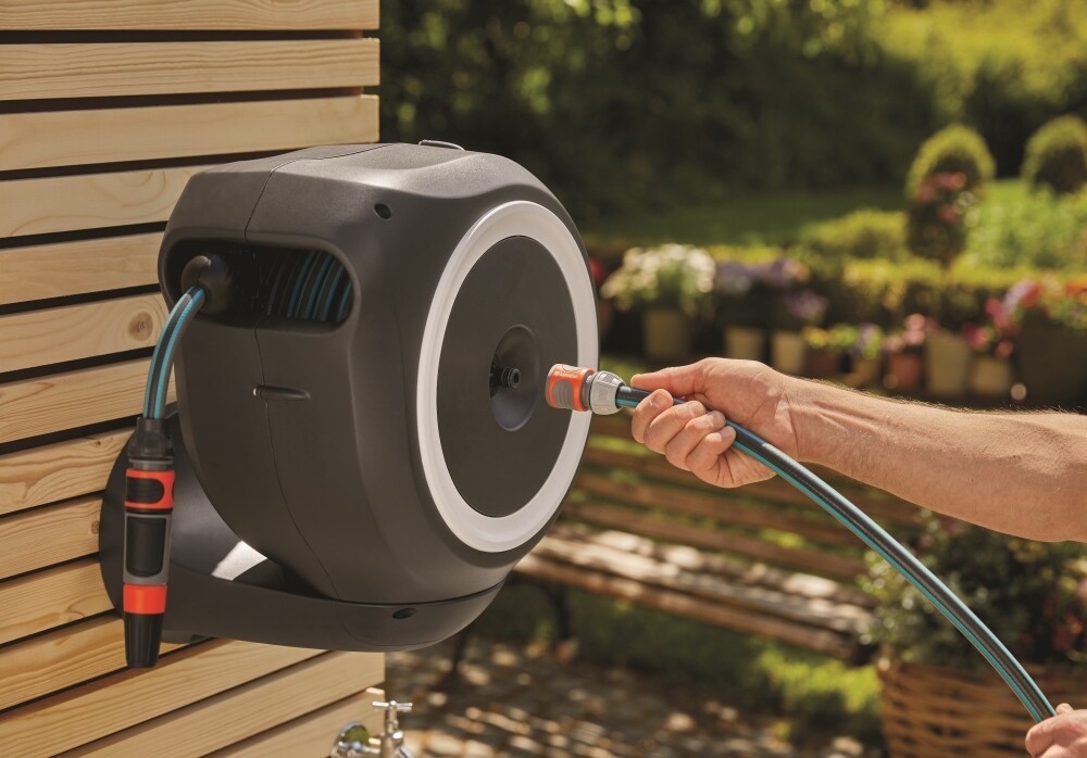 Garden watering is more convenient and effortless than ever with the Wall-Mounted Hose Box RollUp S. It helps to keep your gaden tidy, organised and prevents annoying tripping hazards caused by a hose lying around. The practical hose storage is simply mounted on the wall of your house and connected to the tap with a flexible connecting hose. Thanks to the sturdy wall bracket, the hose box can be swivelled by more than 180° so that you can reach every corner of your garden effortlessly. For direct use, simply extend the garden hose to a maximum length of 15 metres. The garden hose locks automatically in particularly short intervals as soon as you stop, meaning the hose is simple and easy to handle. A light pull on the end of the hose releases the lock and a built-in steel spring with innovative RollControl technology ensures smooth and controlled retraction. The RollControl protects the hose box and surroundings from damage caused by rolling in too fast. To avoid kinks or knots in the water hose, the box has an integrated hose guide. Thanks to the hose and tap connections from the Original GARDENA System you can easily and flexibly attach an extension or other compatible GARDENA Element to the hose. You will always have your GARDENA Hose Attachments to hand. They can be attached underneath the wall bracket and can be stored there to save space. The GARDENA Wall-Mounted Hose Box is both UV- and frost-proof and can be placed on the house wall all year round without hesitation. The high-quality material offers you a long service life and usability without maintenance. In addition, the box cannot be stolen thanks to the secure anti-theft protection and can only be removed from the wall by you. Together with the Wall-Mounted Hose Box you will receive the wall bracket, a flexible connecting hose, all necessary Original GARDENA System and Assembly Parts as well as a nozzle with two different spray jet options. This high-quality product comes with a five-year warranty from GARDENA. Watering that’s always ready for action—with the GARDENA Wall-Mounted Hose Box RollUp S.